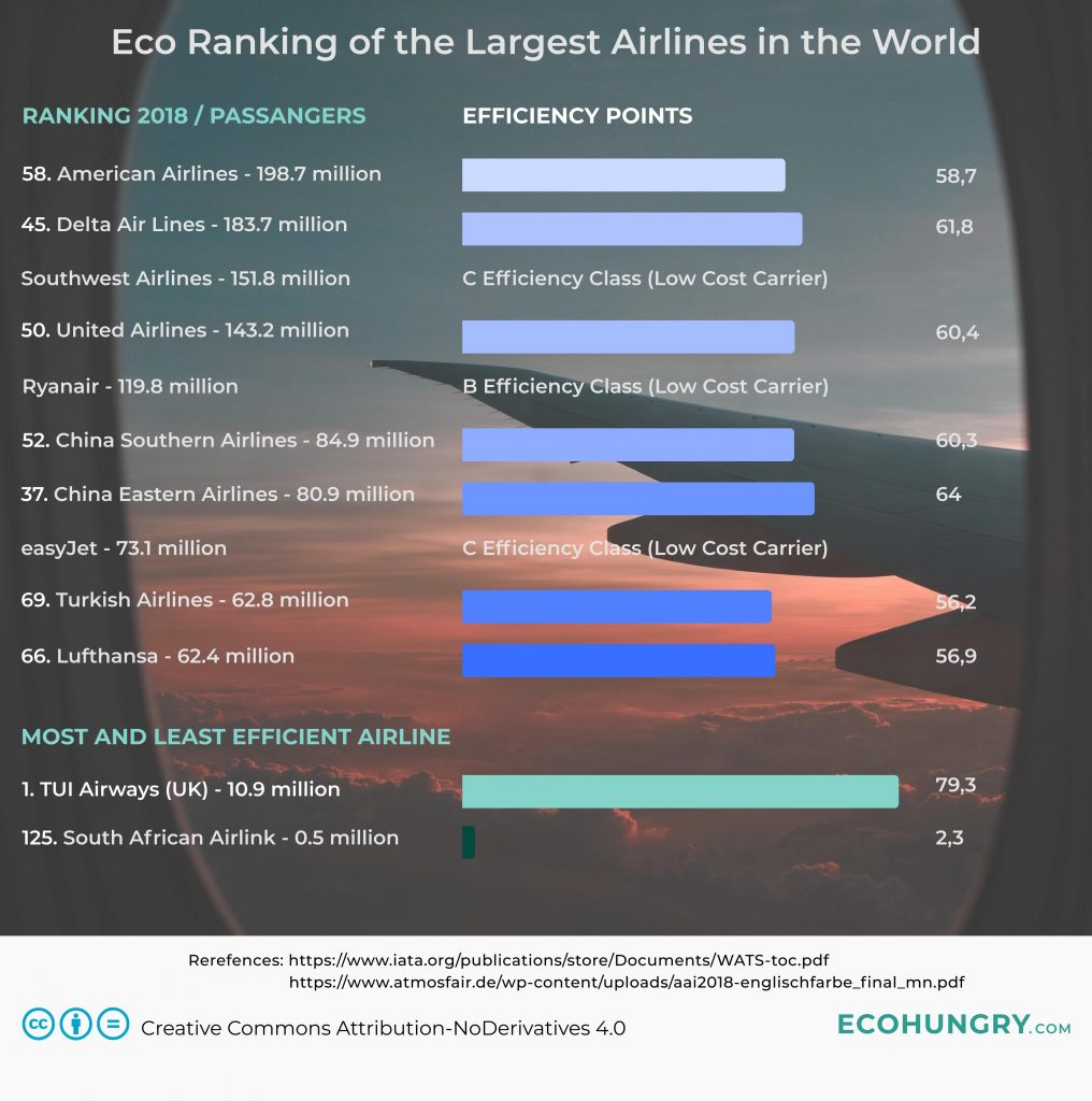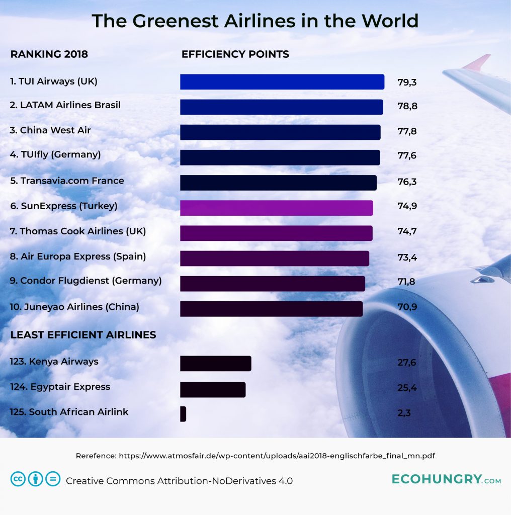 The obvious answer would be the more efficient on the list the better it is. However, there is a factor that is more important in most cases. Which one has the least amount of changes? The more direct the flight, the fewer changes, the fewer emissions. The combination of the most efficient airline with the least amount of changes gives the greenest option.